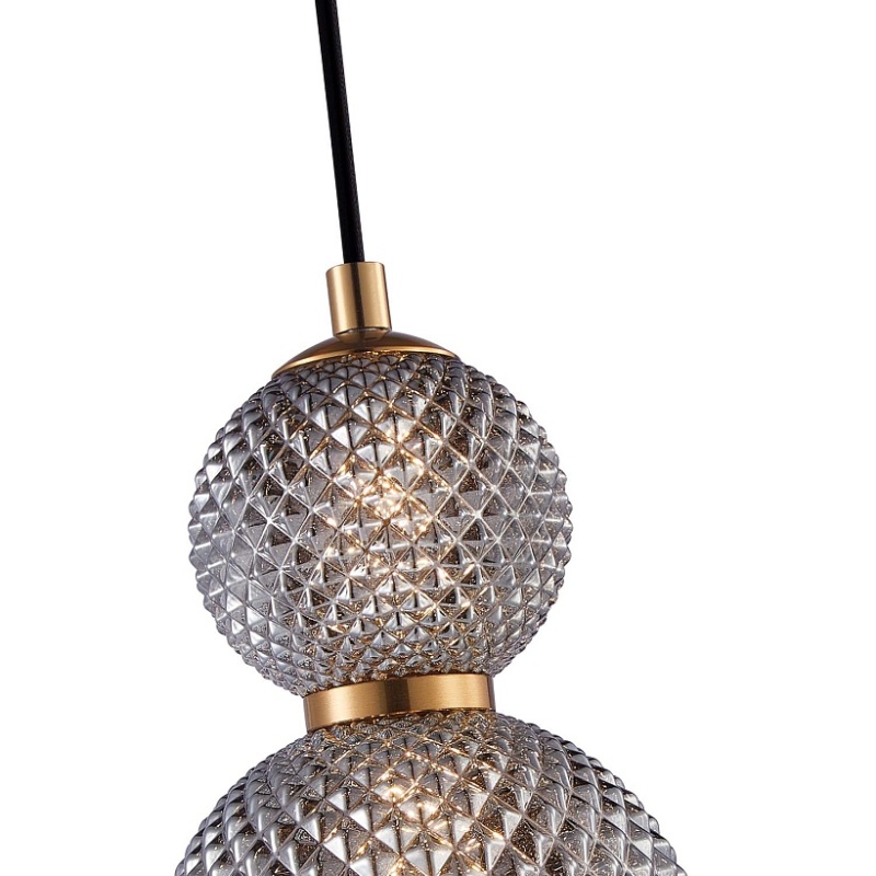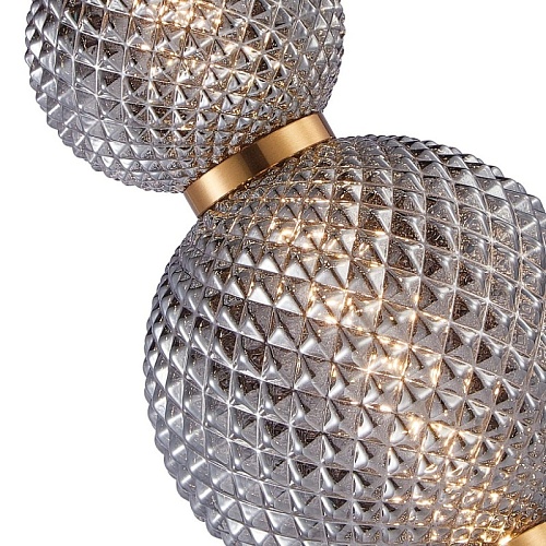 Каркас из металла черного матового цвета, плафон из фактурного стекла дымчато-серого цвета, декоративный ободок золотого цвета, регулируемая высота, LED-модуль.
