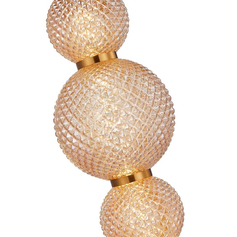 Каркас из металла цвета латунь, плафон из фактурного стекла янтарного цвета, декоративный ободок золотого цвета, регулируемая высота, LED-модуль.