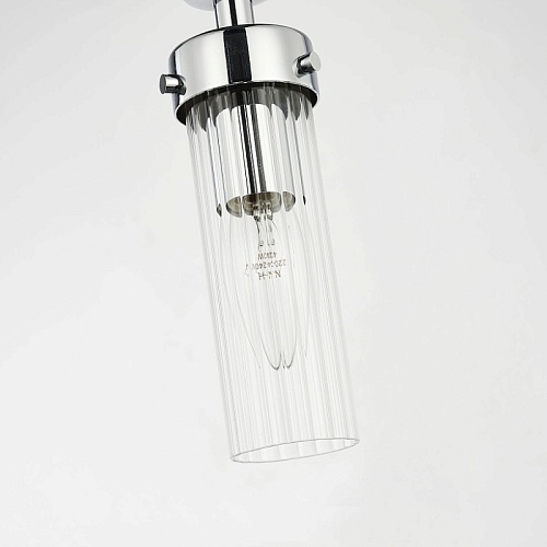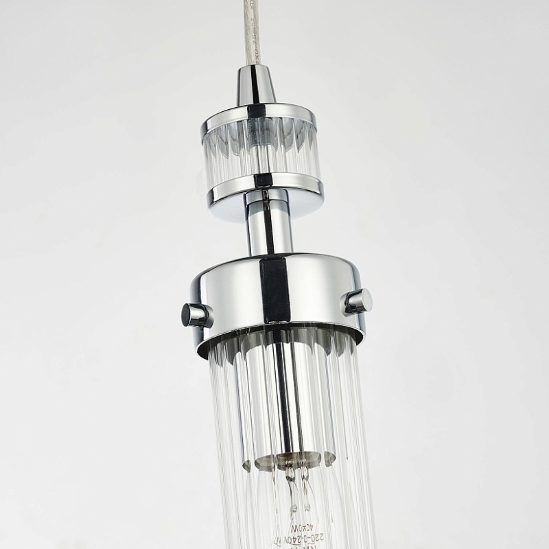 Хромированный металлический каркас, плафон из прозрачного рифленого стекла, регулируемая высота.