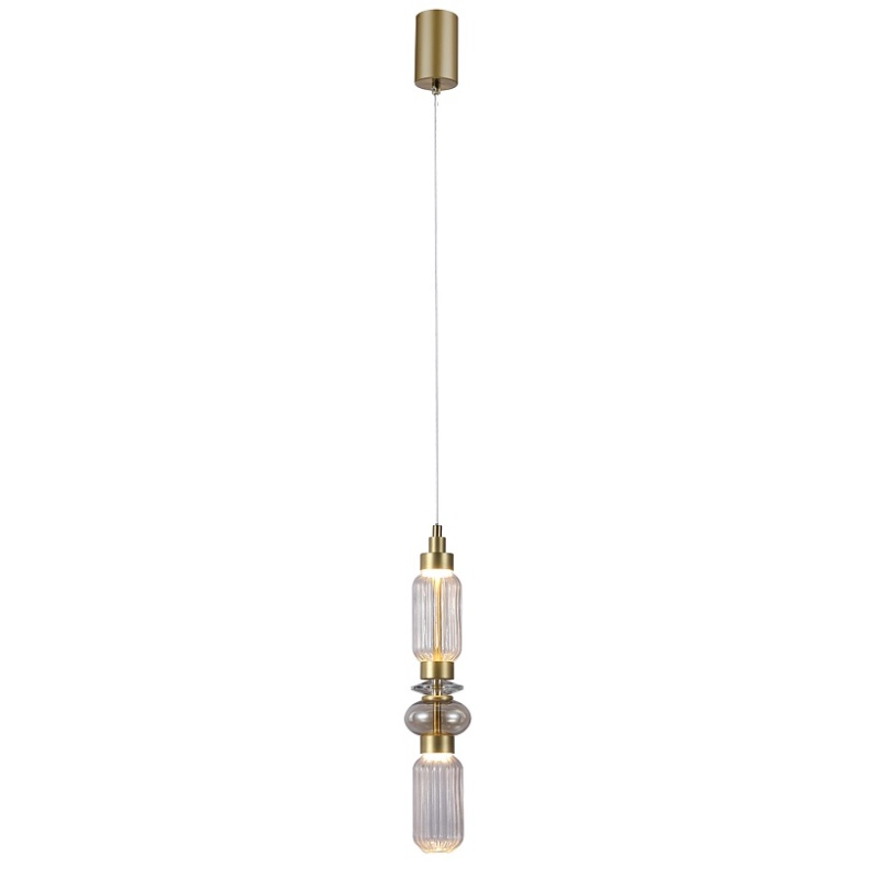 Металлический каркас в цвете латунь, плафон из стекла, выполненного по муранской технологии в прозрачном, янтарном и дымчато-сером цвете, модуль LED, регулируемая высота.