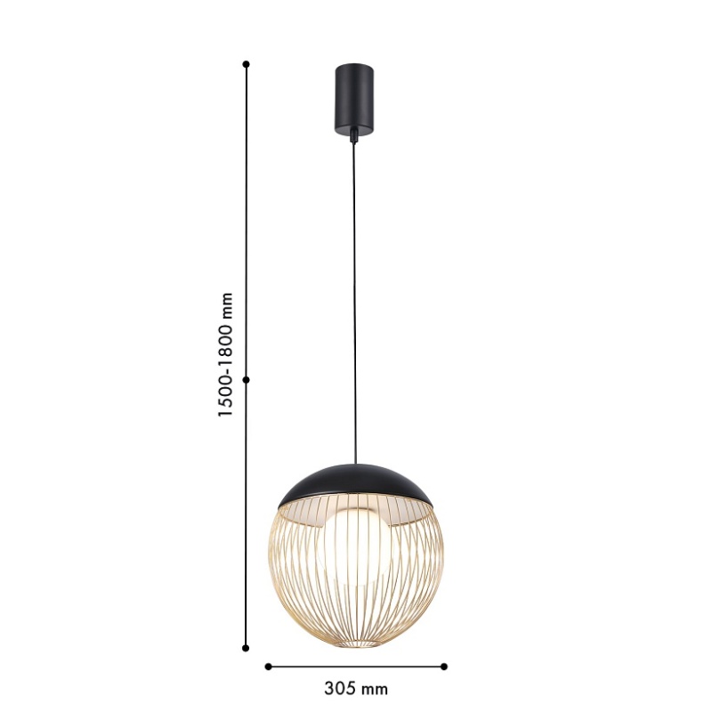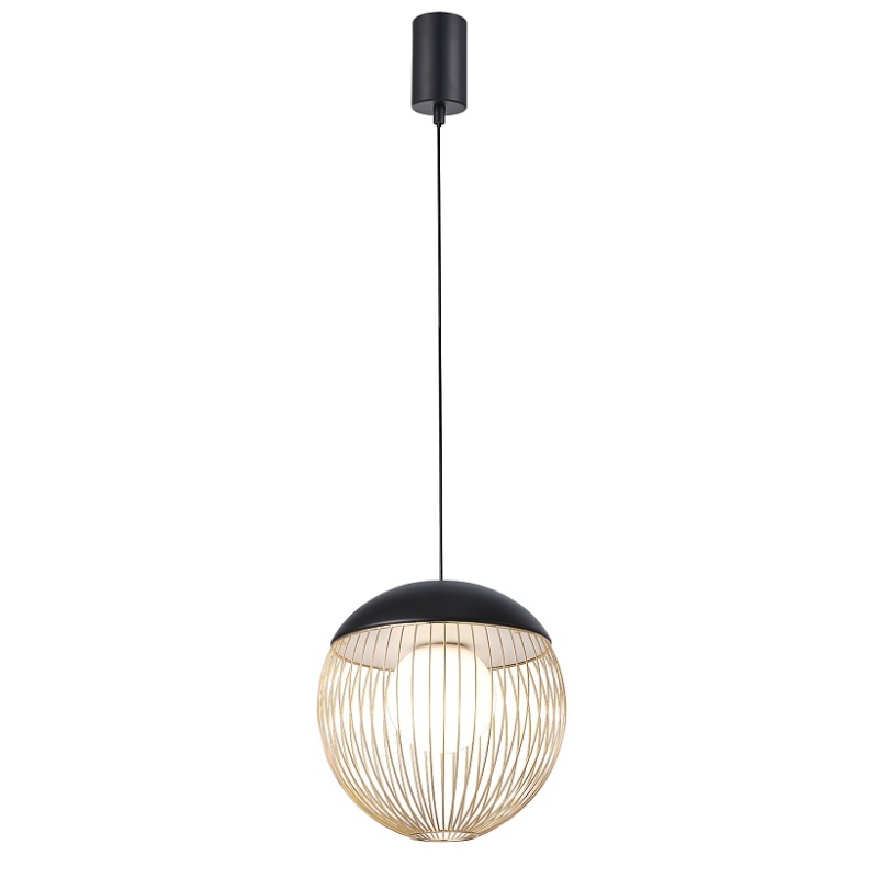 Подвес диаметром 30 см, стеклянный выдувной плафон заключен в проволочный каркас из тонких, спаянных между собой металлических трубочек, каркас в черном цвете с золотым, модуль LED, регулируемая высота.