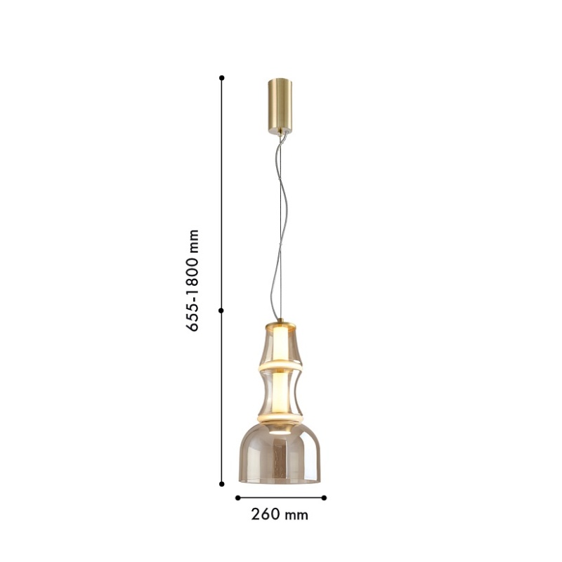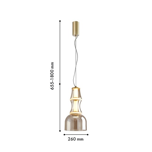 Подвес с каркасом в цвете золото, плафон в янтарном цвете диаметром 26 см, трубочка с LED-лентой, регулируемая высота.