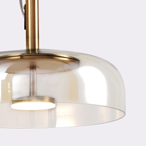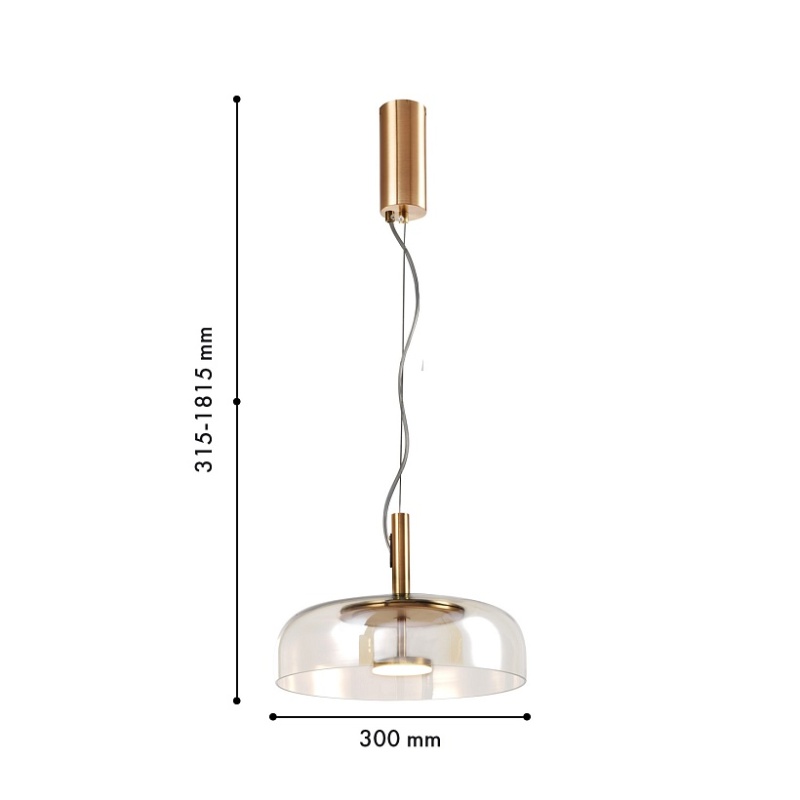 Металлический каркас в цвете латунь, с выдувным плафоном из прозрачного стекла, внутри которого находится светящийся элемент с модулем LED, регулируемая высота.