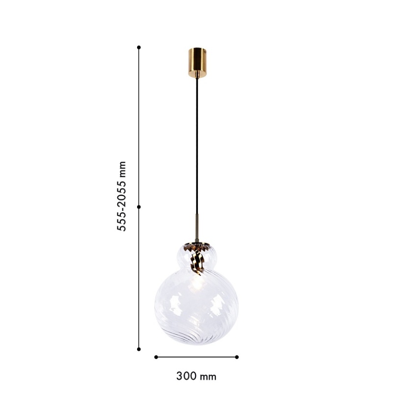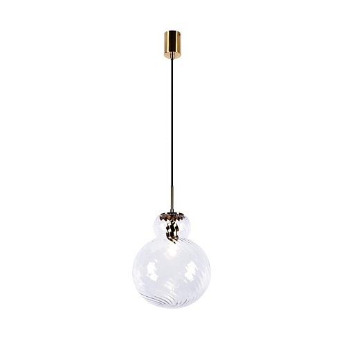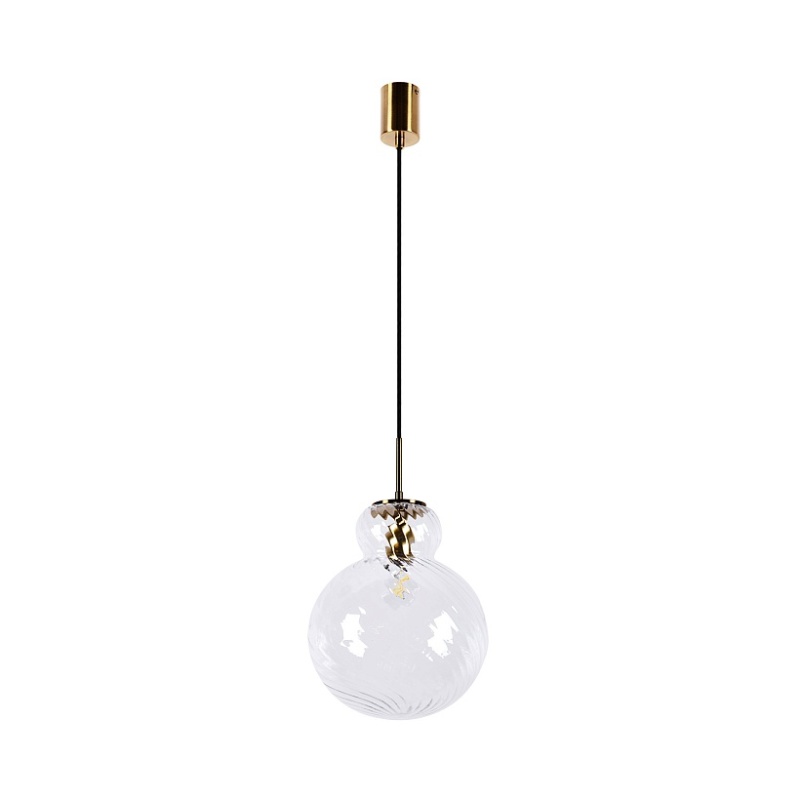 Подвес с плафоном из выдувного прозрачного фактурного стекла, каркас в цвете латунь, цоколь Е14, регулируемая высота.