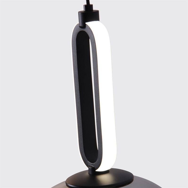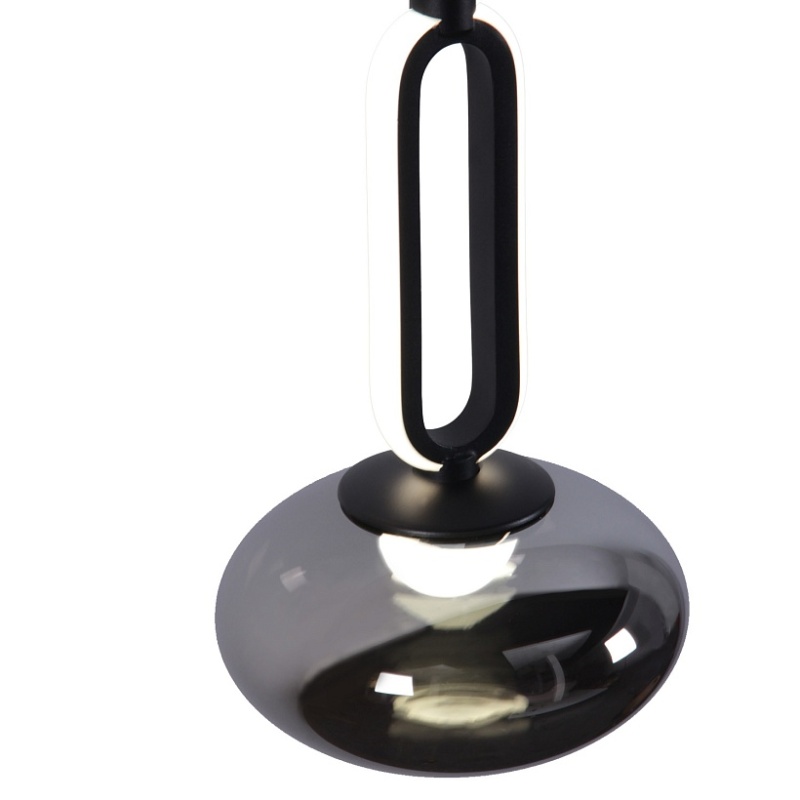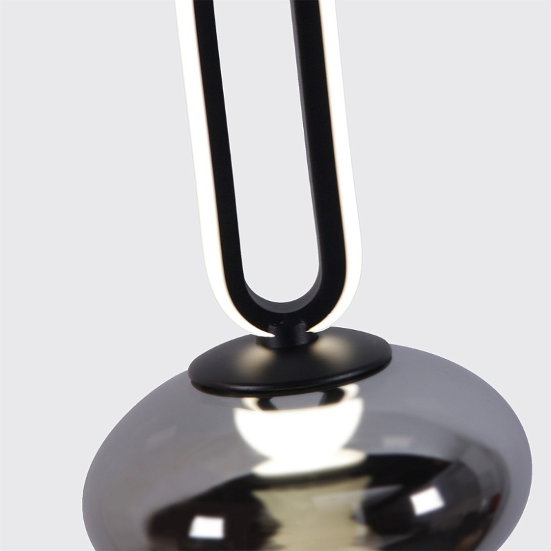 Металлический каркас в черном цвете с выдувным стеклянным плафоном, внутри расположен LED-модуль с закругленным акриловым рассеивателем, декоративный элемент с LED-лентой по внешнему периметру.