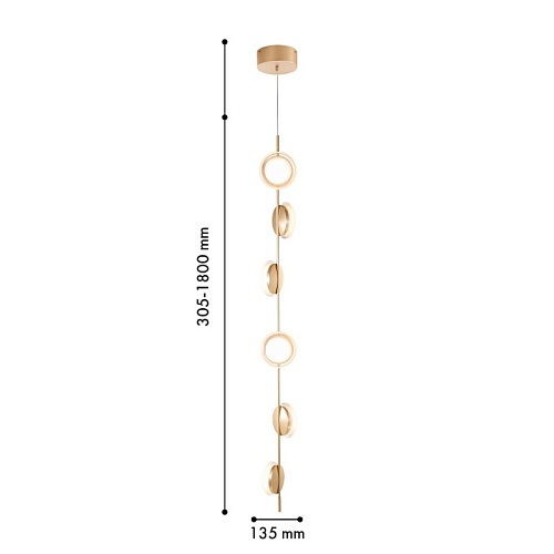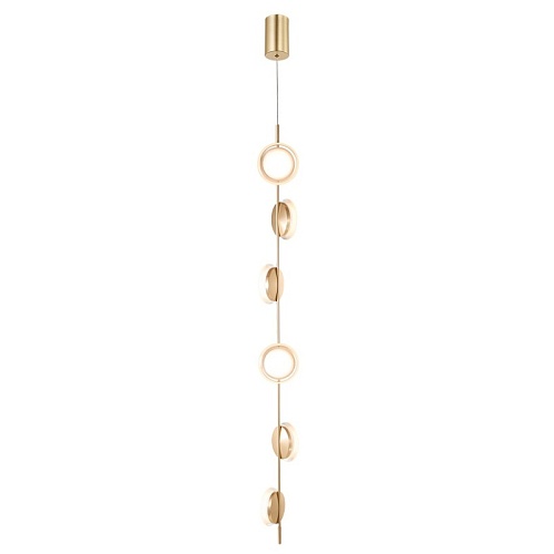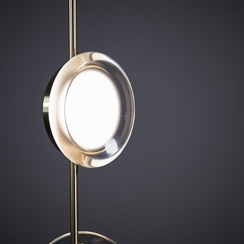 Металлический каркас золотого цвета, акриловые плафоны в виде дисков с прозрачным объемным ободком и плоской матовой внутренней частью со встроенным модулем LED, регулируемая высота.