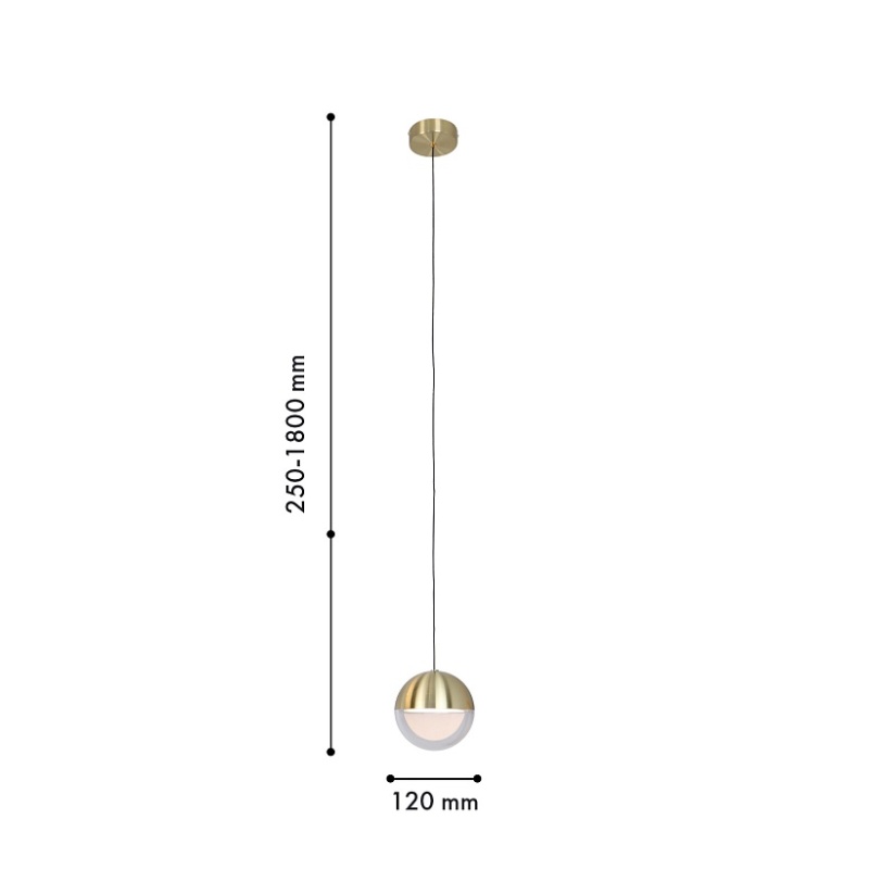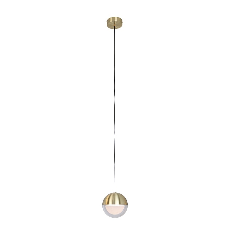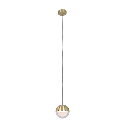 Подвес с каркасом в золотом цвете, с шарообразным плафоном, разделенным на две части — металлическую и акриловую, в центре плафона расположен LED-модуль, создающий оригинальный световой эффект, регулируемая высота.