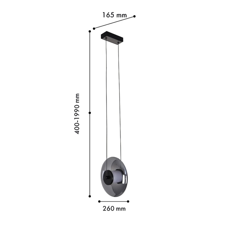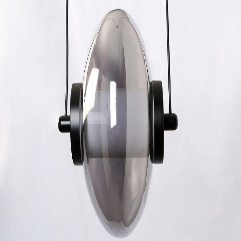 металлический каркас черного матового цвета, вертикальное крепление плоского сферического выдувного плафона из дымчато-серого стекла, по периметру сердцевины плафона расположен модуль LED, регулируемая высота.