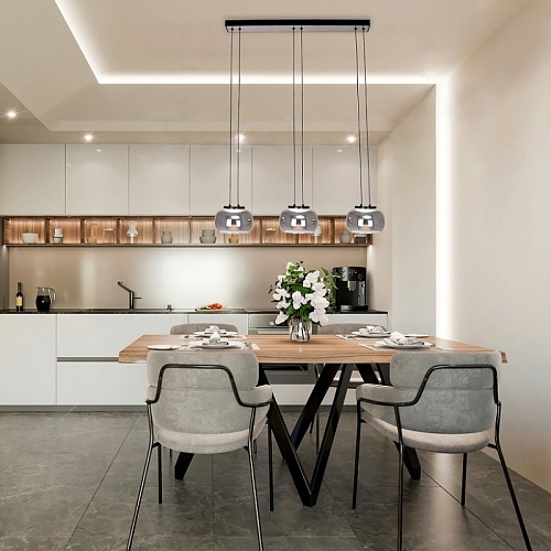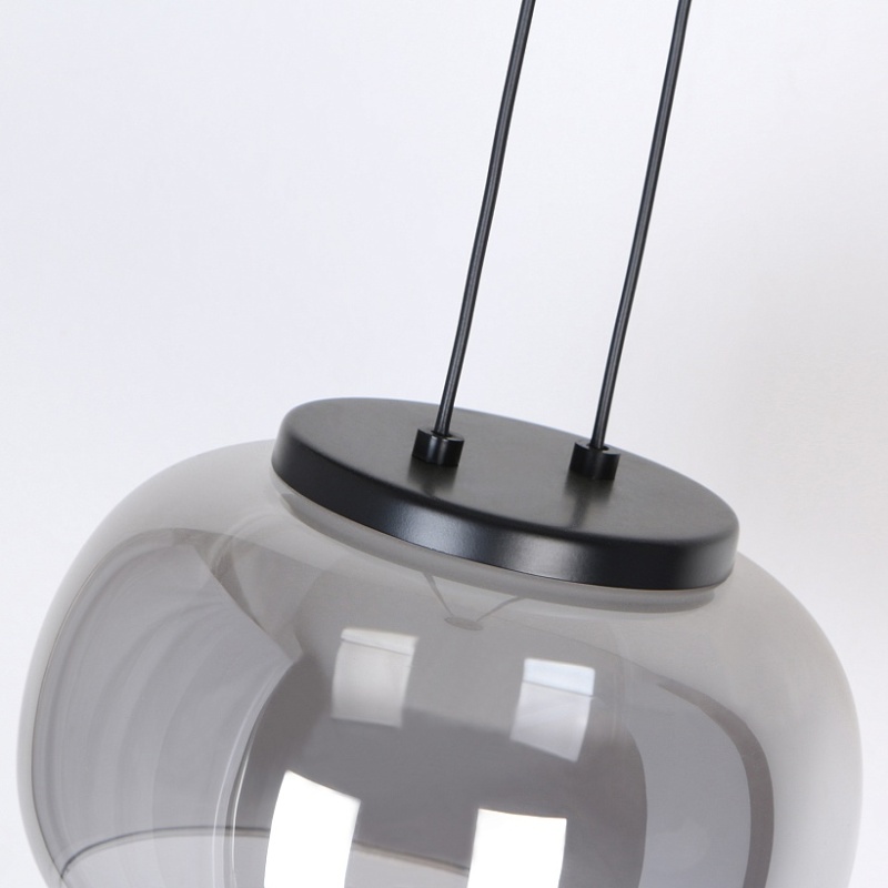 Металлический каркас черного цвета и декором в цвете никель, плафон из выдувного стекла дымчато-серого цвета, встроенный модуль LED, регулируемая высота.