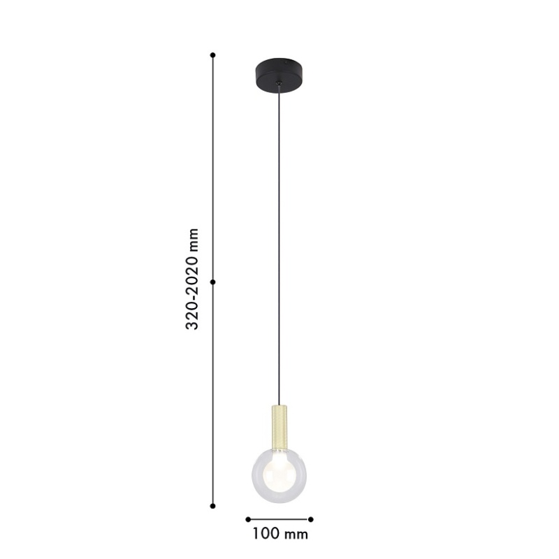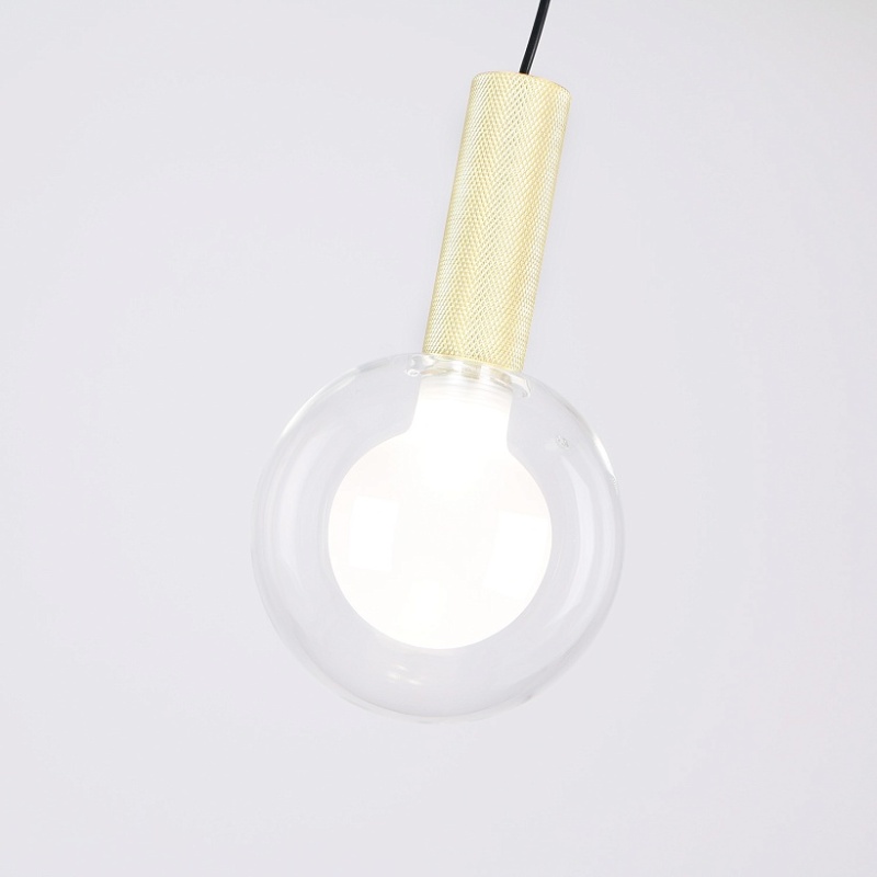 Металлический каркас в цвете матовое золото с плафоном из двойного стекла — прозрачного снаружи и матового внутри, декоративный цоколь в форме металлического цилиндра с рифленым решетчатым узором, LED-модуль, регулируемая высота.