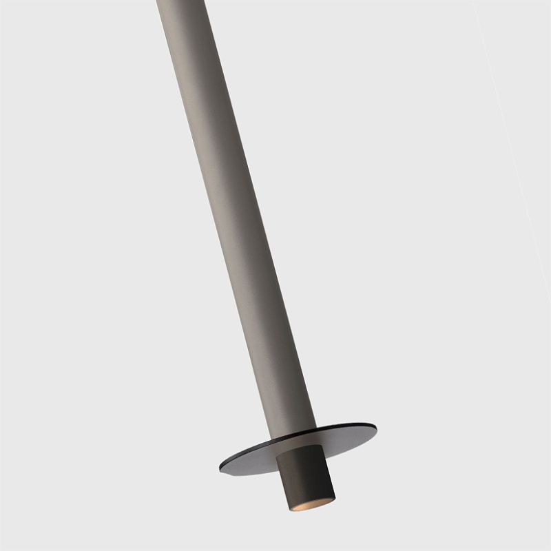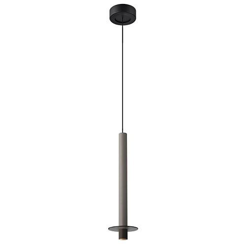 Металлический каркас черного цвета, плафон из алюминия в форме тонкого удлиненного цилиндра в сером цвете, в нижней части подвеса расположен светодиодный источник света, регулируемая высота.