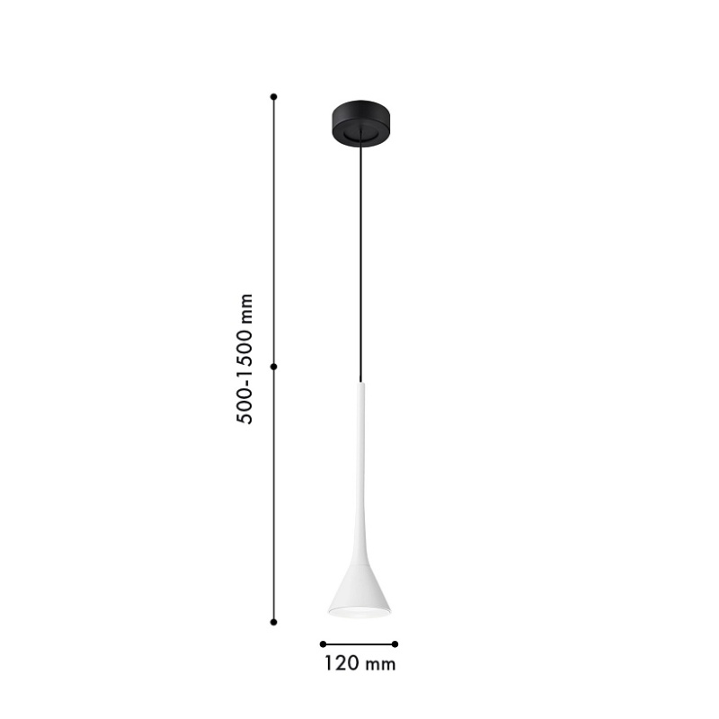 Металлический каркас черного цвета, плафон из алюминия в форме тонкого удлиненного цилиндра с конусом на конце в белом цвете, в нижней части подвеса расположен светодиодный источник света, регулируемая высота.