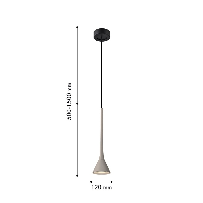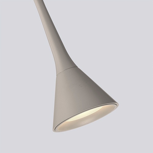 Металлический каркас черного цвета, плафон из алюминия в форме тонкого удлиненного цилиндра с конусом на конце в сером цвете, в нижней части подвеса расположен светодиодный источник света, регулируемая высота.