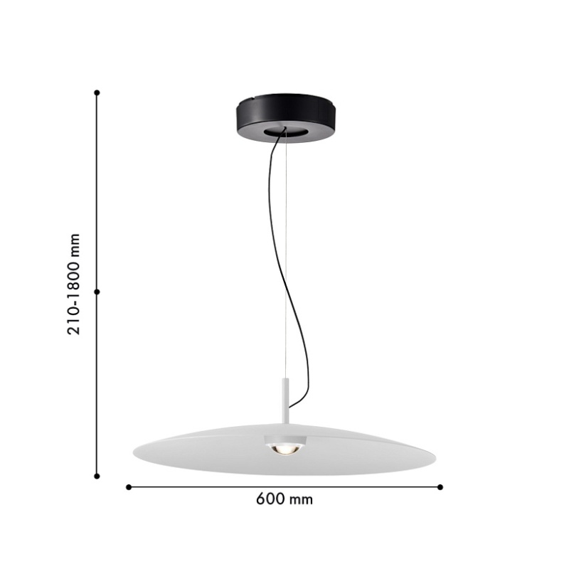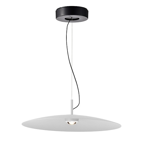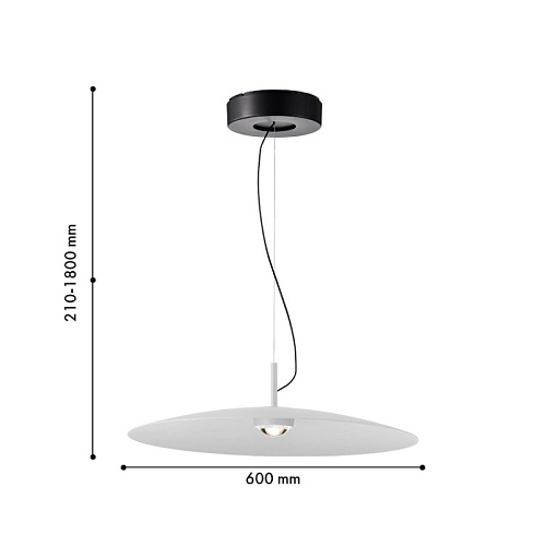 Металлический каркас черного цвета, плафон в белом цвете, диаметром 60 см, алюминиевый плафон имеет лаконичный силуэт и оснащен светодиодным источником света под акриловой лупой, регулируемая высота.