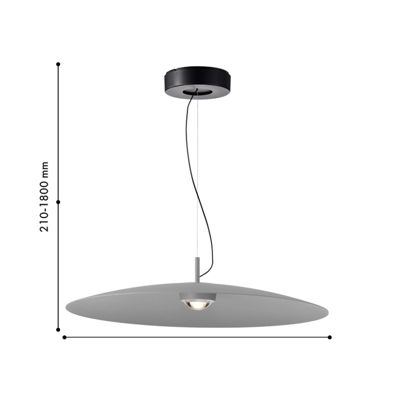 Металлический каркас черного цвета, плафон в сером цвете, диаметром 60 см, алюминиевый плафон имеет лаконичный силуэт и оснащен светодиодным источником света под акриловой лупой, регулируемая высота.