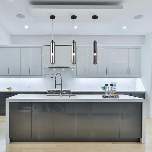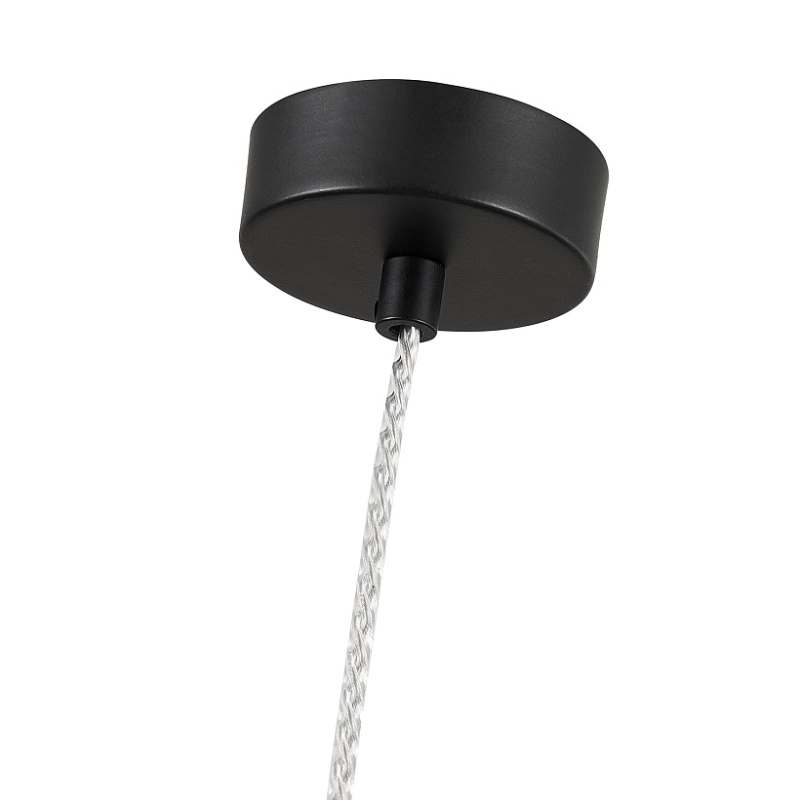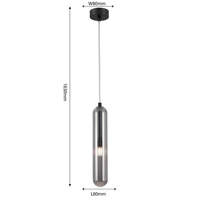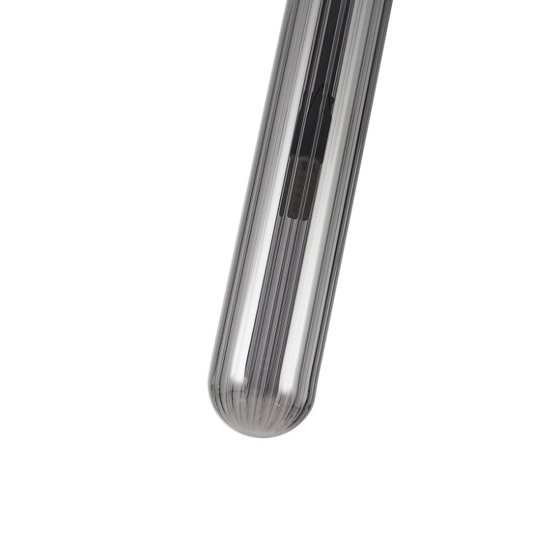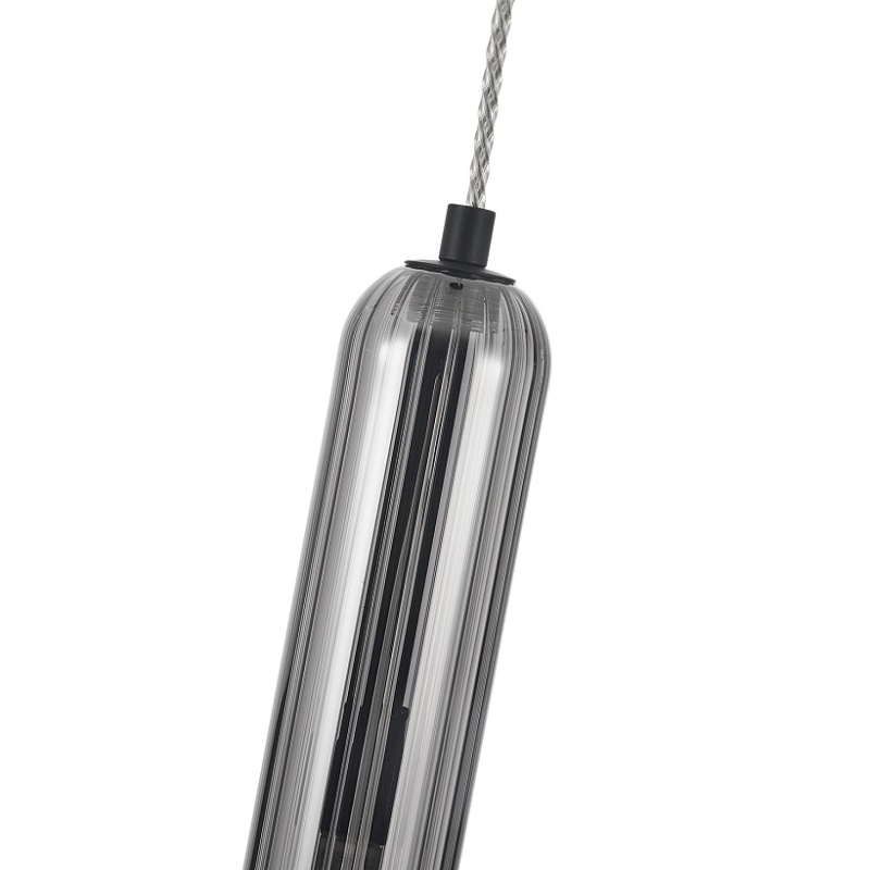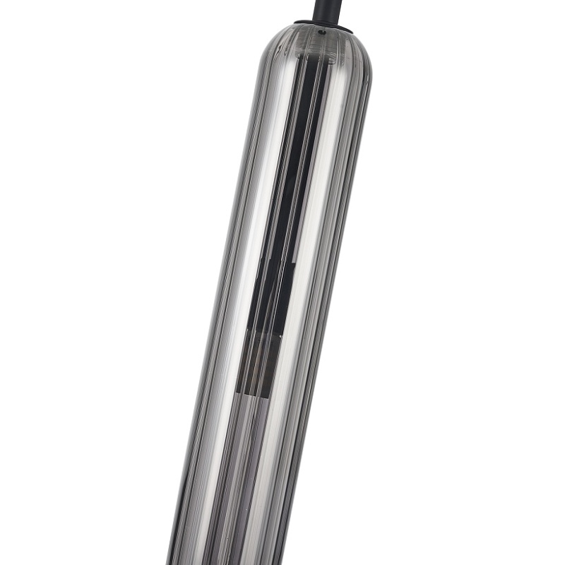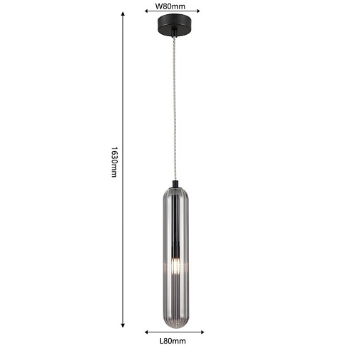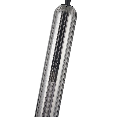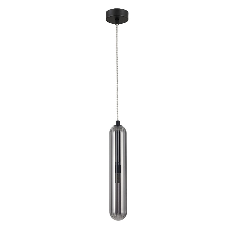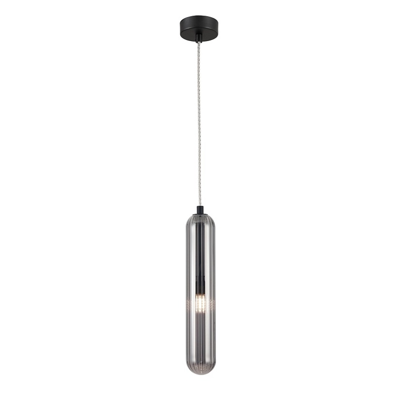 Металлический каркас черного матового цвета, дымчато-серый удлиненный стеклянный плафон, сменная лампа G9.