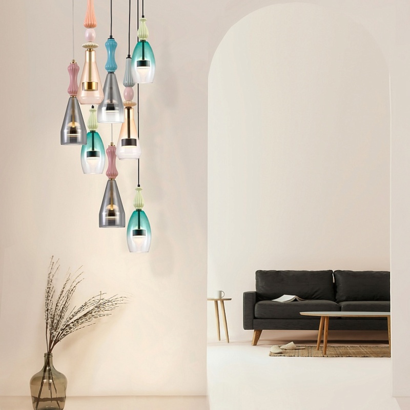 Металлический каркас черного цвета, плафон с градиентным переходом из прозрачного в кофейный цвет, изготовлен из выдувного стекла, декорирован керамическими глазурованными элементами, встроенный модуль LED, регулируемая высота.