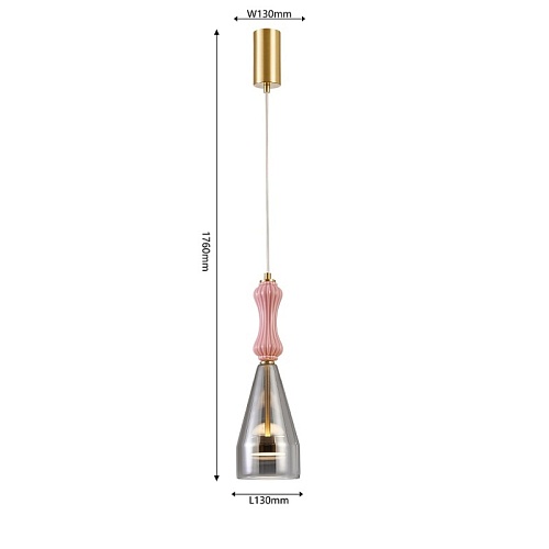 Металлический каркас золотого цвета, плафон с градиентным переходом из прозрачного в дымчато-серый цвет, изготовлен из выдувного стекла, декорирован керамическими глазурованными элементами, встроенный модуль LED, регулируемая высота.