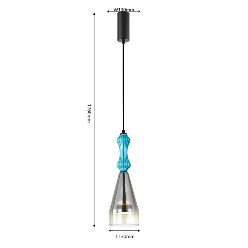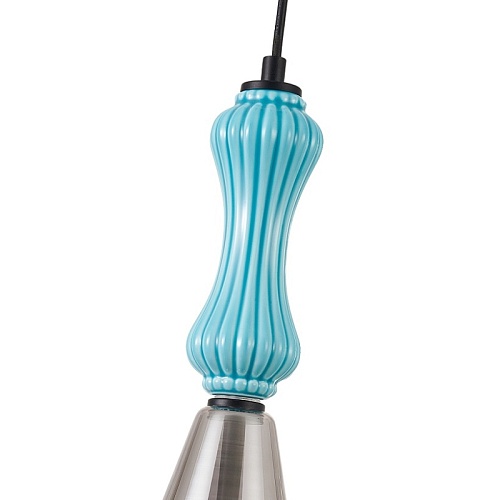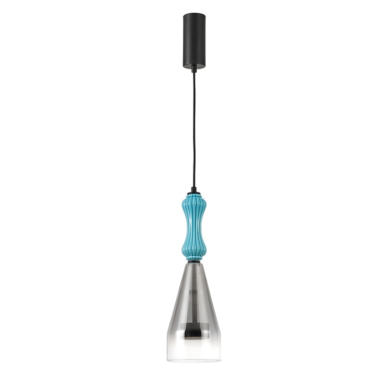 Металлический каркас черного цвета, плафон с градиентным переходом из прозрачного в дымчато-серый цвет, изготовлен из выдувного стекла, декорирован керамическими глазурованными элементами, встроенный модуль LED, регулируемая высота.