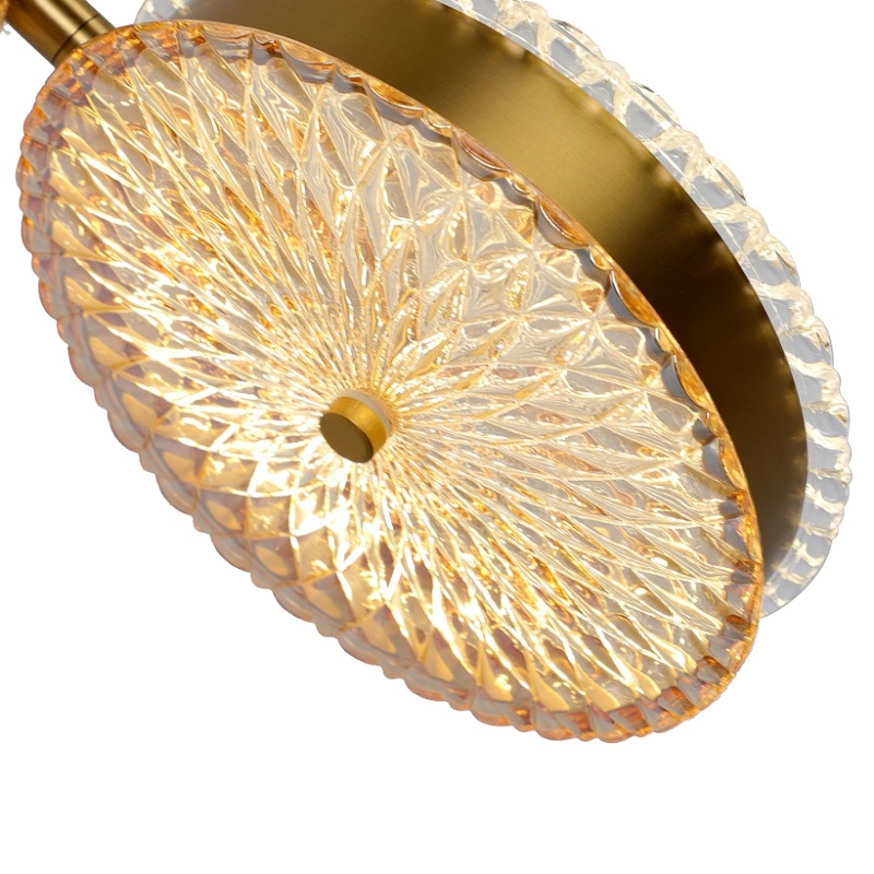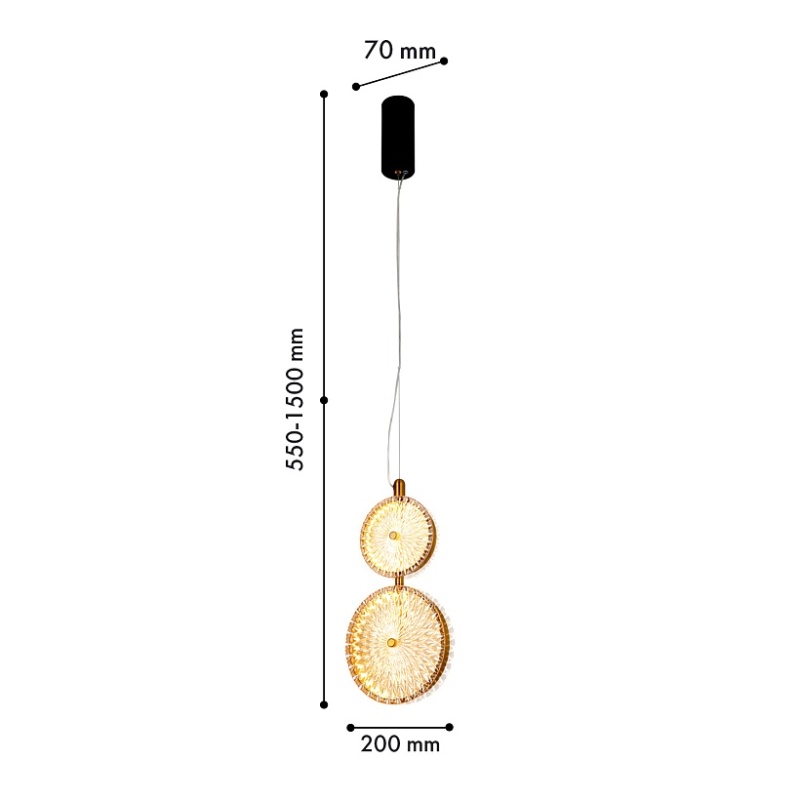 Каркас черного цвета, подвес состоит из двух плафонов разного размера, каждый плафон состоит из двух узорных стеклянных дисков прозрачного и янтарного цвета, внутри которых расположен LED-модуль, регулируемая высота.