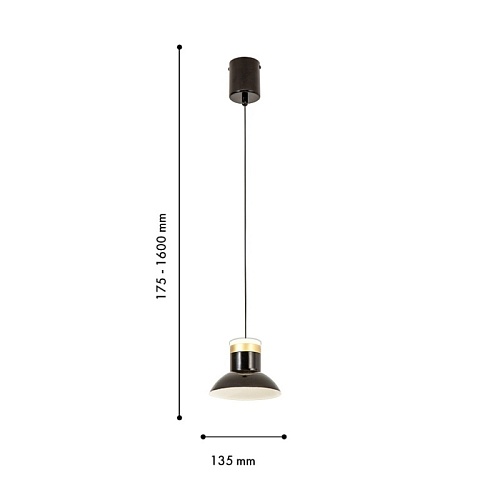 Черный глянцевый металлический каркас, акриловый плафон внутри абажура, дополнительный декоративный источник света в верхней части абажура, декоративный элемент из металла в цвете матовое золото.