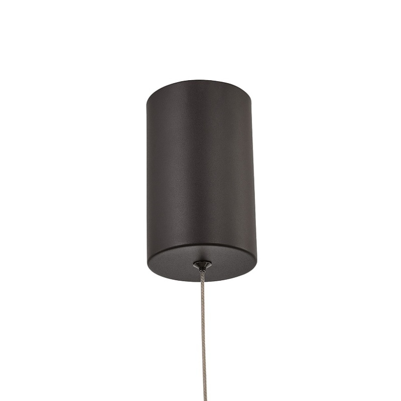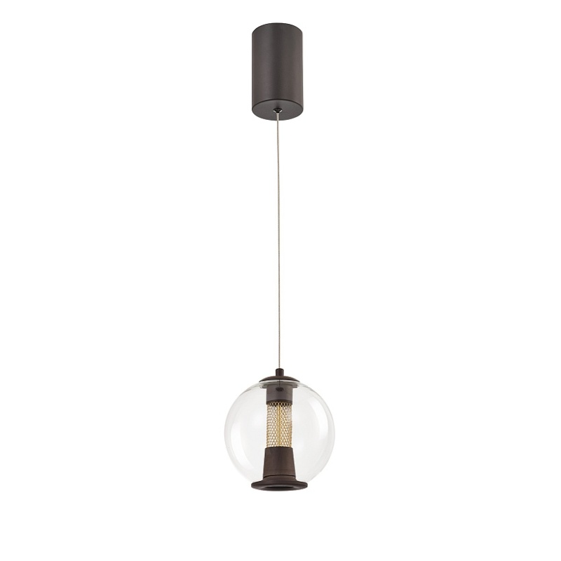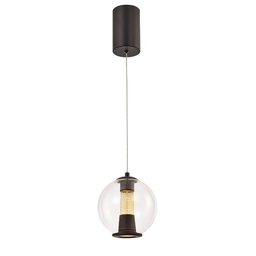 Металлический каркас черного цвета, конструкция плафона включает в себя выдувное стекло, украшенное внутренней декоративной металлической решеткой, модуль LED, регулируемая высота.