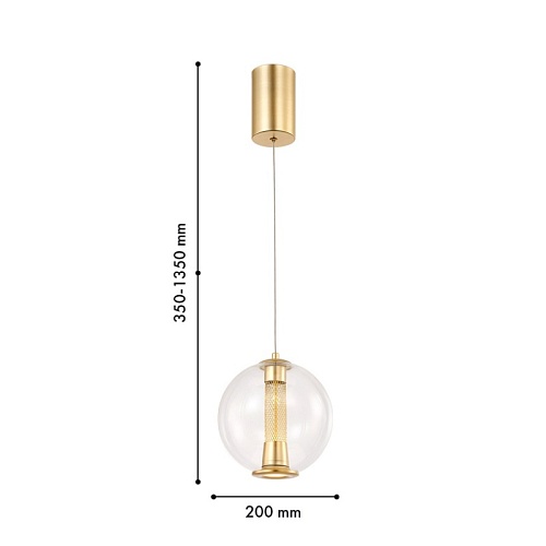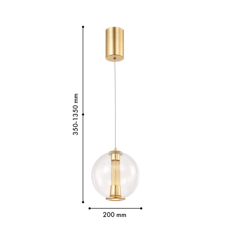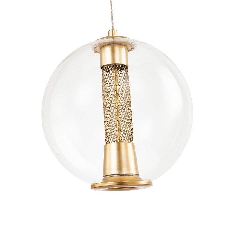 Металлический каркас в цвете золото, конструкция плафона включает в себя выдувное стекло, украшенное внутренней декоративной металлической решеткой, модуль LED, регулируемая высота.