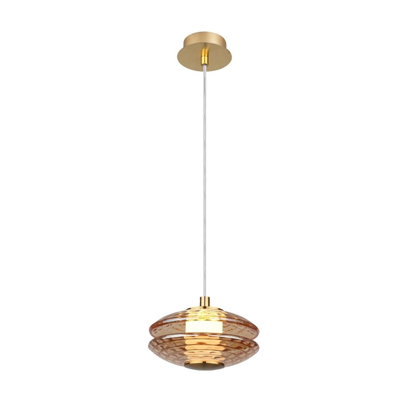 Металлический каркас цвета латунь, закругленный фактурный плафон из стекла янтарного цвета, регулируемая высота, LED-модуль.