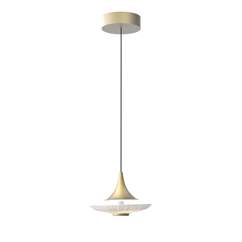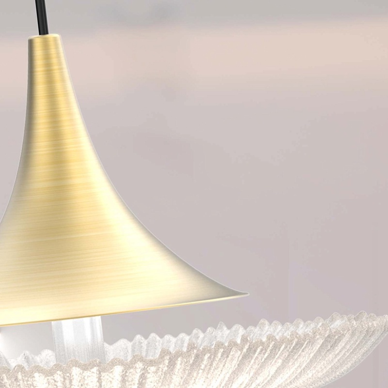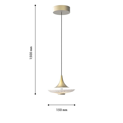 Металлический каркас золотого матового цвета с гальваническим покрытием, плафон из прозрачного стекла с волнистым эффектом, регулируемая высота, LED-модуль.