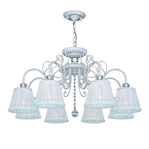 Металлический каркас состаренного белого цвета с золотом, абажуры из белой органзы, декор из прозрачного хрусталя, регулируемая высота.