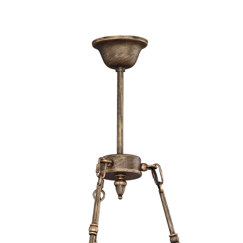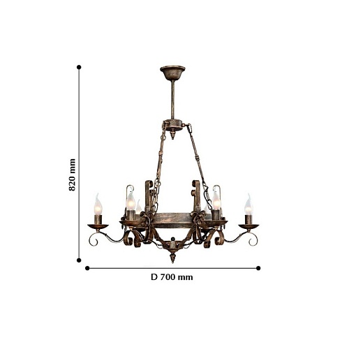 Металлический каркас состаренного коричневого цвета с золотом, сменные лампы в виде пламени свечи, декоративные кованные элементы и цепи.