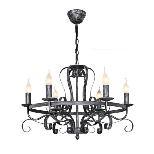 Металлический каркас состаренного черного цвета с серебром, сменные лампы в виде пламени свечи, декоративные кованные элементы.