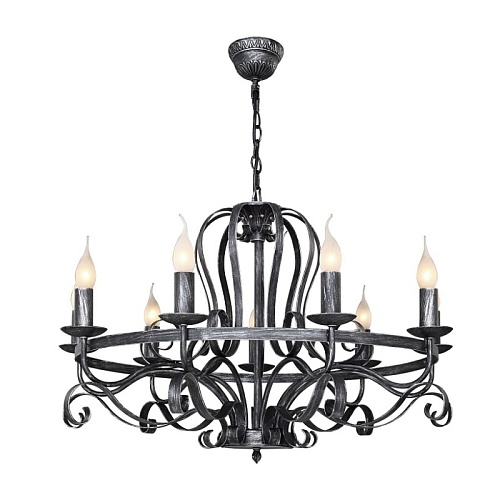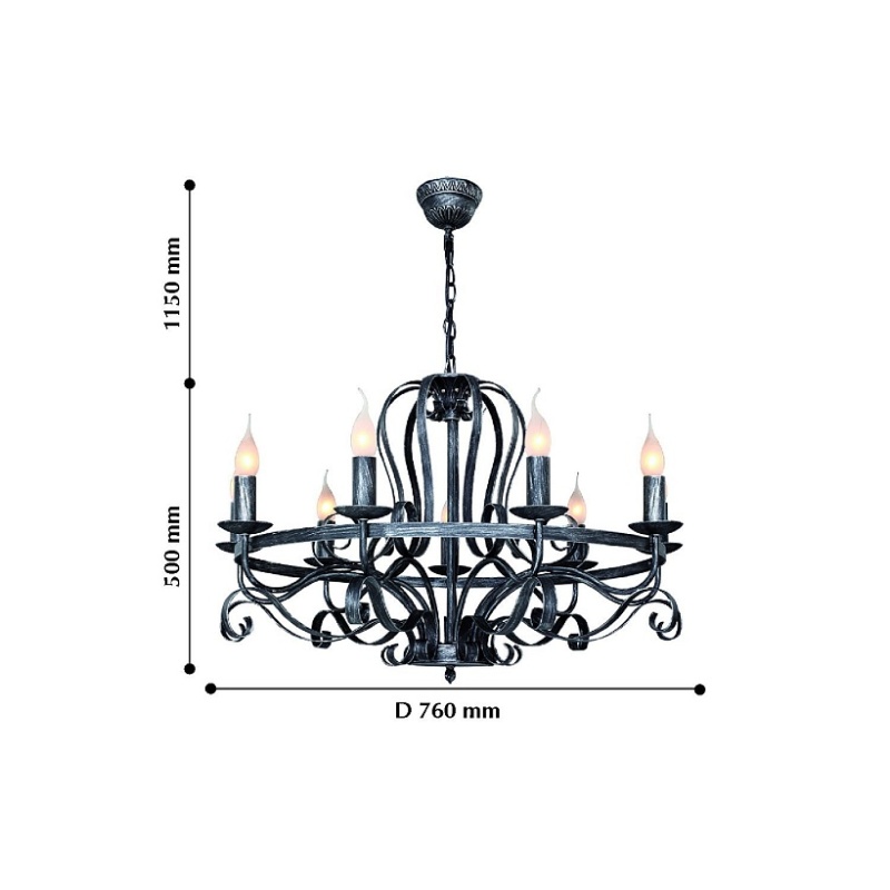 Металлический каркас состаренного черного цвета с серебром, сменные лампы в виде пламени свечи, декоративные кованные элементы.