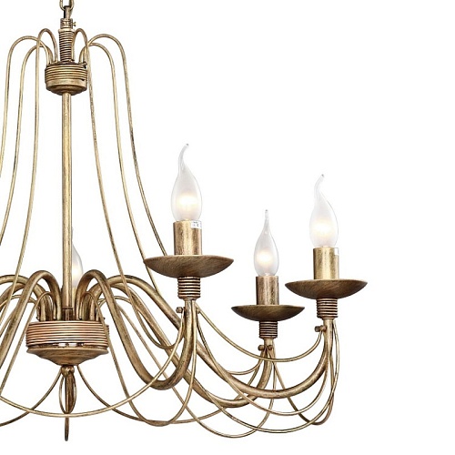 Металлический каркас состаренного коричневого цвета с золотом, сменные лампы в виде пламени свечи, регулируемая высота.