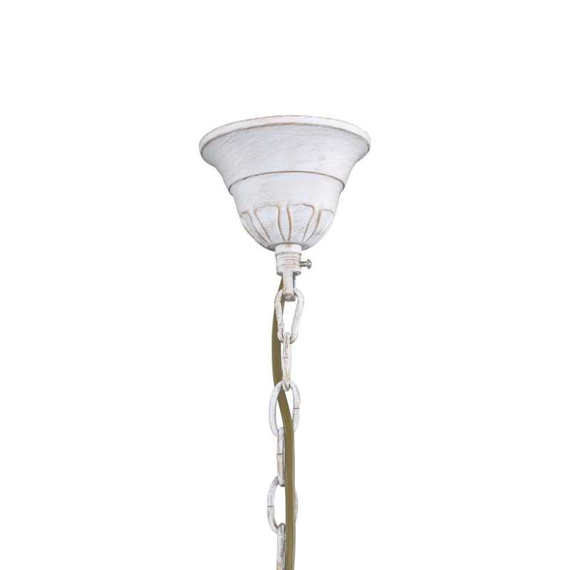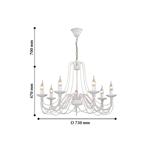 Металлический каркас состаренного белого цвета с золотом, сменные лампы в виде пламени свечи, регулируемая высота.
