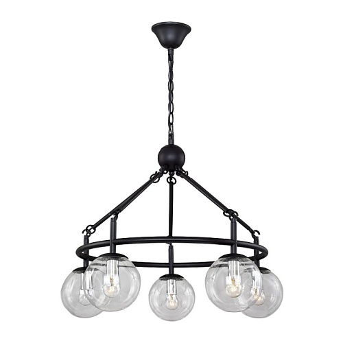 Металлический каркас черного цвета, плафоны из прозрачного выдувного стекла, регулируемая высота, сменные лампы.