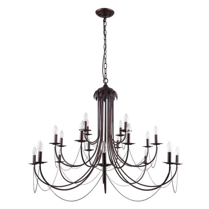 Металлический каркас кофейного цвета, декор из тонких цепей, регулируемая высота, сменные лампы.