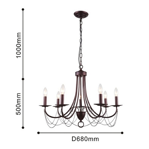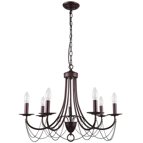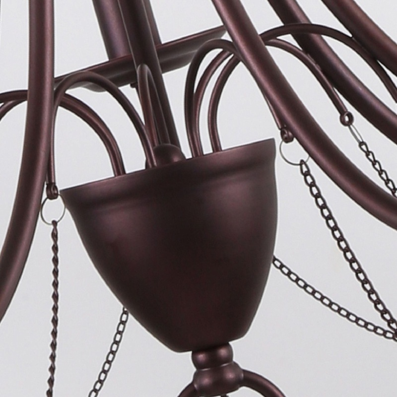 Металлический каркас кофейного цвета, декор из тонких цепей, регулируемая высота, сменные лампы.