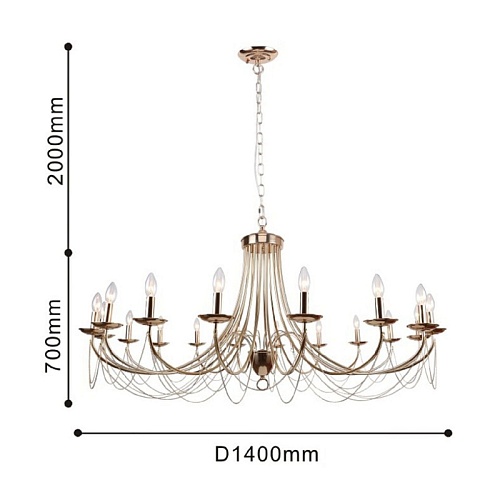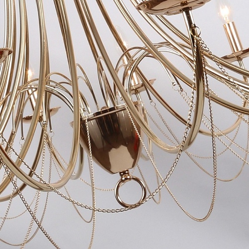 Металлический каркас золотого цвета, декор из тонких цепей, регулируемая высота, сменные лампы.