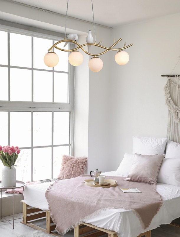 каркас цвета матового золота, стеклянные плафоны кремового цвета, декоративный элемент в виде белой птицы