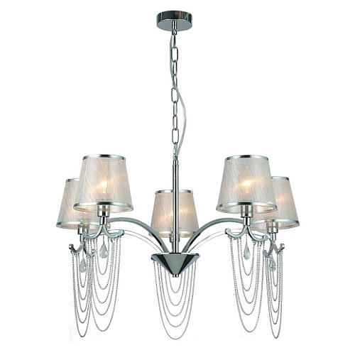 каркас и декоративные цепочки цвета хром, хрустальная подвеска, плафон из полупрозрачной серебристой ткани с серебряной тесьмой
