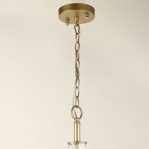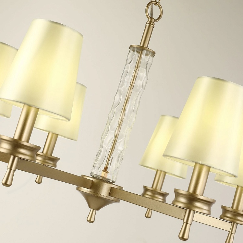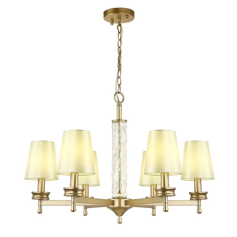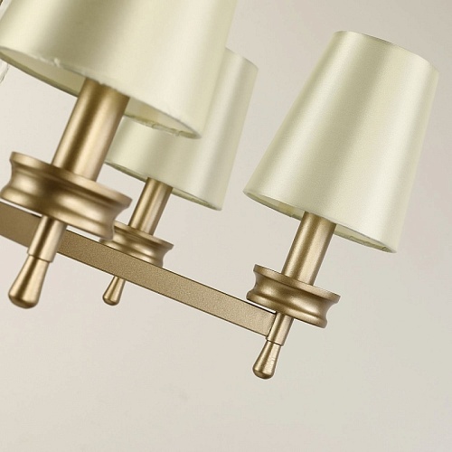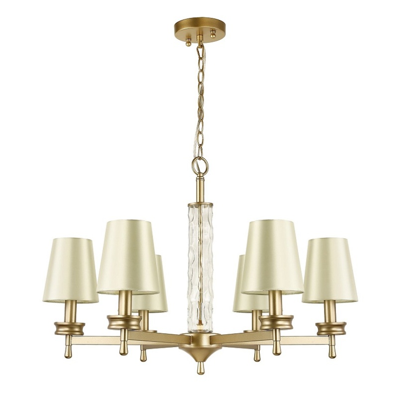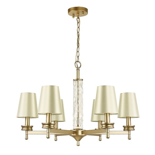 каркас цвета матового золота, плафон из бежевой атласной ткани, декоративные элементы из прозрачного стекла