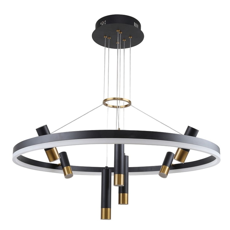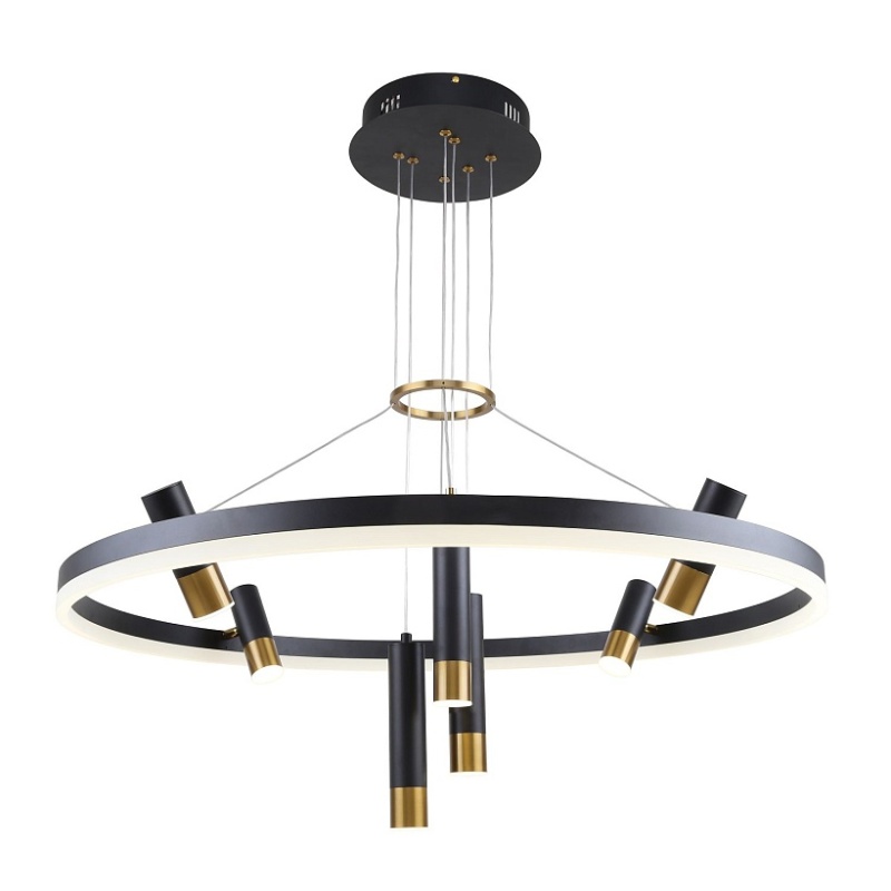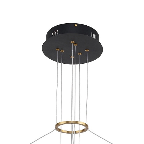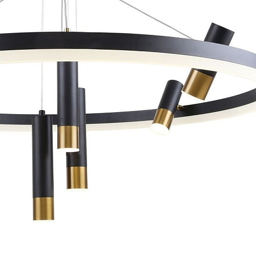 Каркас матового черного цвета, декоративные элементы цвета латуни, несколько источников света: круговая LED лента с рассеивателем из белого непрозрачного акрила и плафоны с углом поворота до 180°, регулируемая высота.