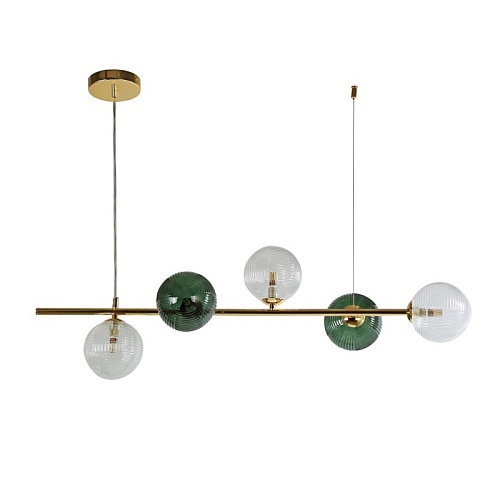 Металлический каркас цвета светлого золота, стеклянные плафоны прозрачного и зеленого цвета, сменная лампа, регулируемая высота.