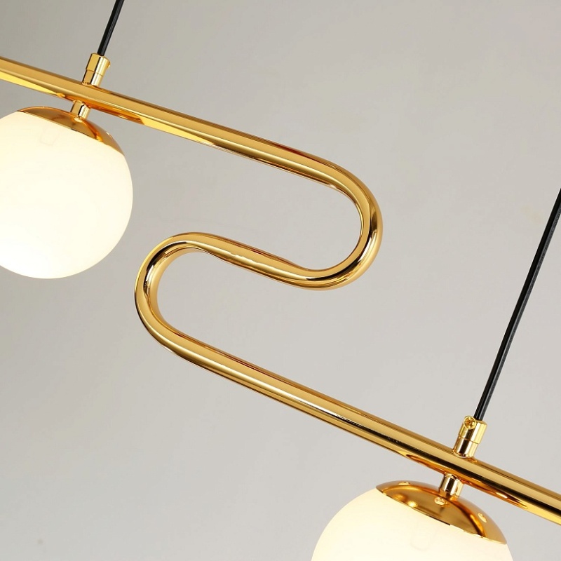 каркас изогнутой формы цвета золота, плафоны из белого стекла