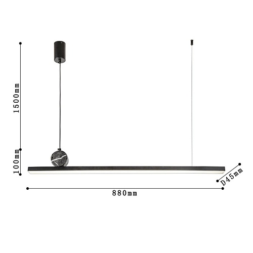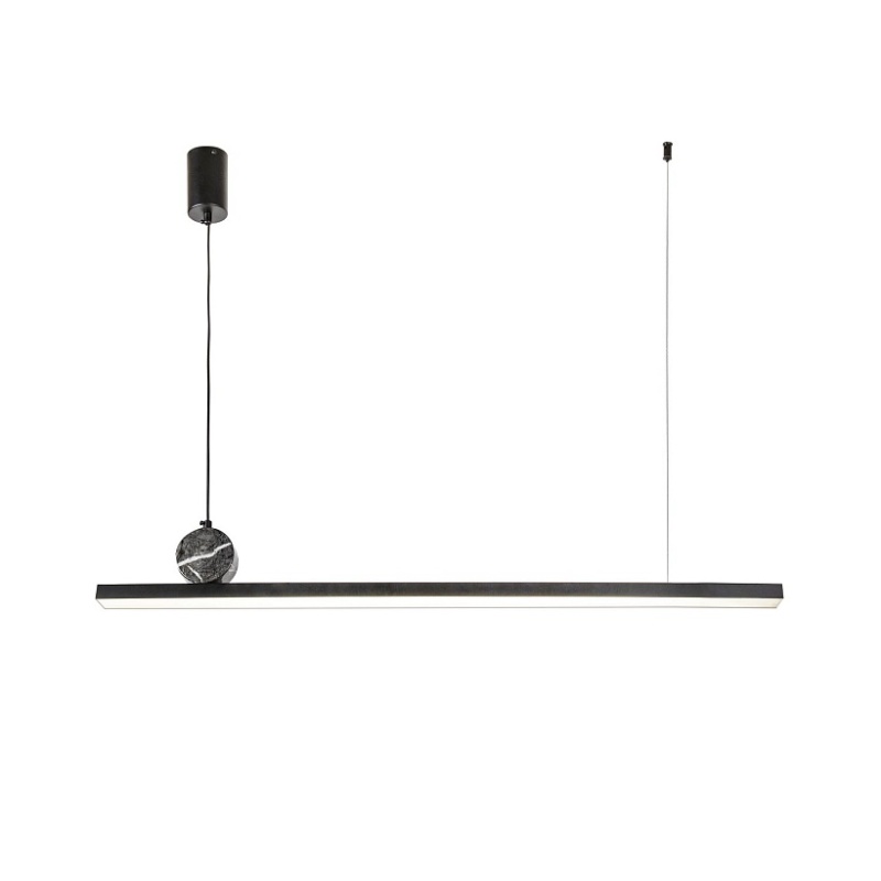 Металлический каркас матового черного цвета, рассеиватель из белого акрила, круглый декоративный элемент цвета черного мрамора, часть Металлический каркаса фиксируется тросиком для баланса, регулируемая высота.