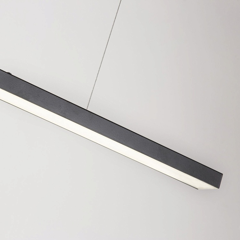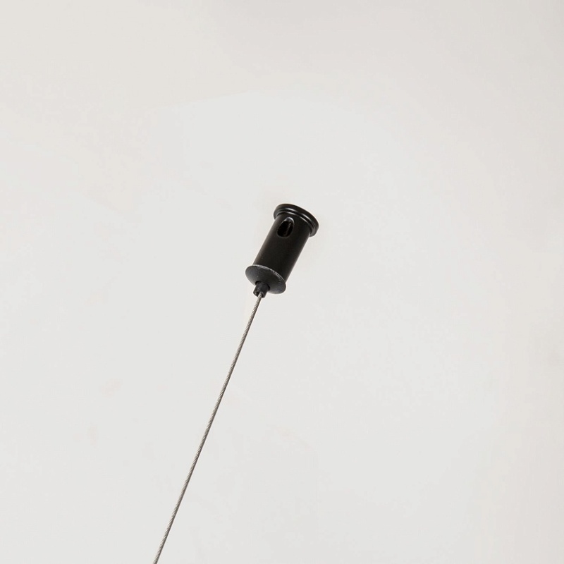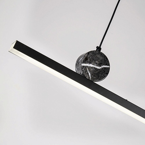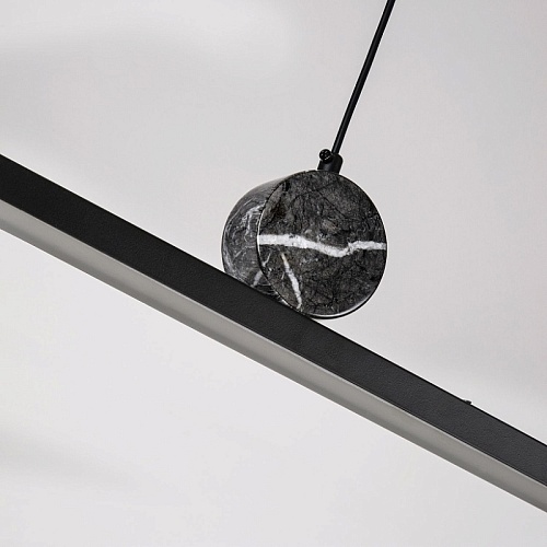 Металлический каркас матового черного цвета, рассеиватель из белого акрила, круглый декоративный элемент цвета черного мрамора, часть Металлический каркаса фиксируется тросиком для баланса, регулируемая высота.