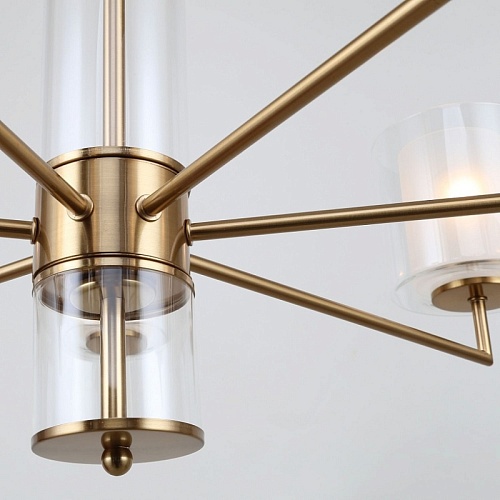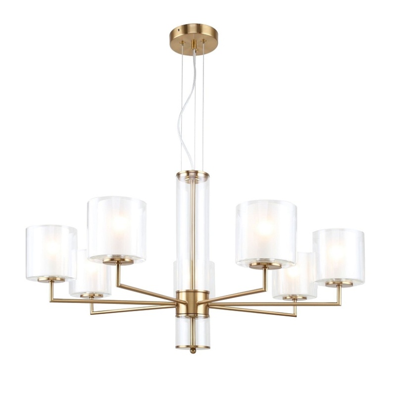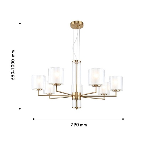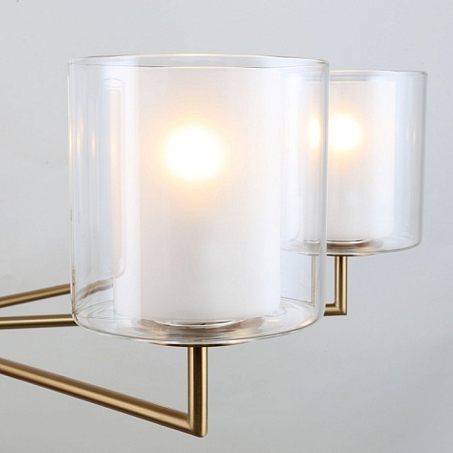 Металлический каркас латунного цвета, двуслойные плафоны из прозрачного и белого стекла, стеклянный декор на центральном штоке, регулируемая высота.
