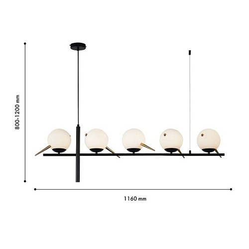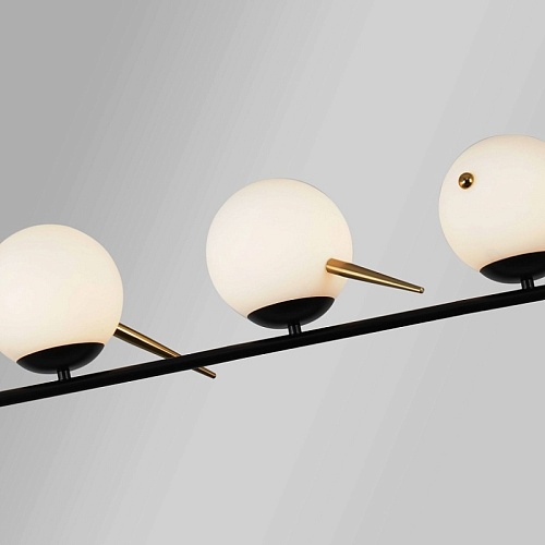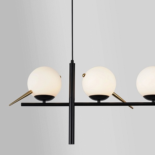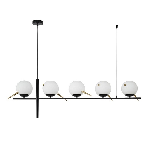 Каркас черного цвета, выдувные плафоны из стекла белого цвета с декоративными элементами из металла золотого цвета. Высота подвесной люстры регулирует