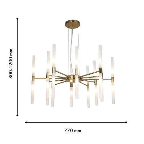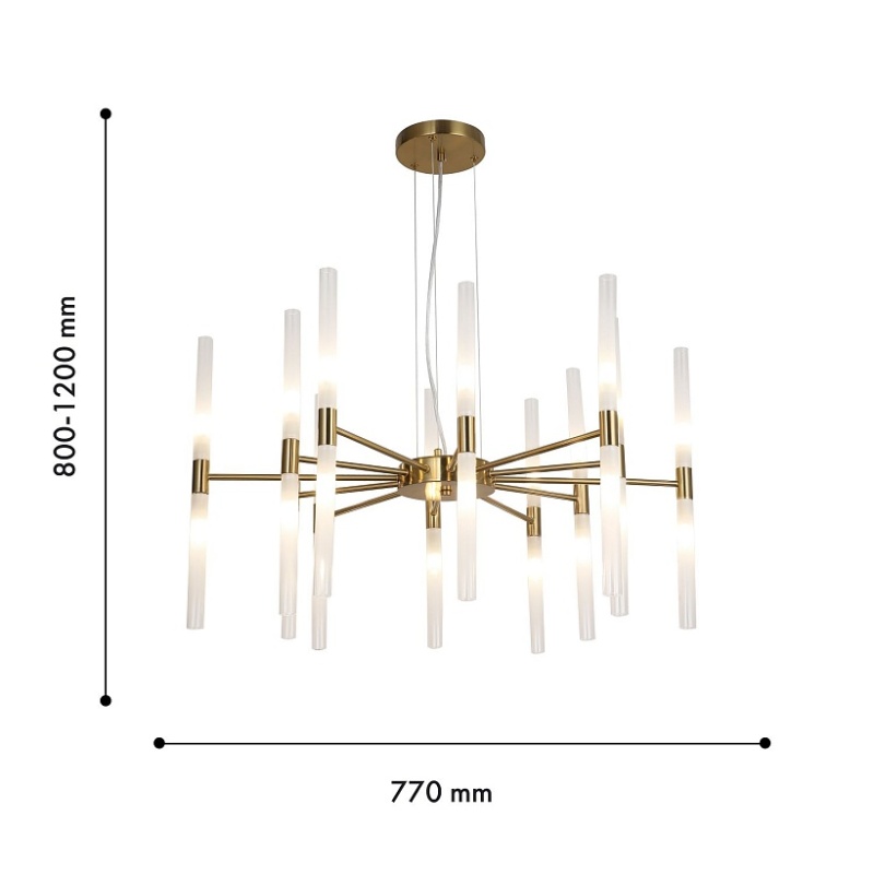 Металлический каркас цвета латунь, сочетание коротких латунных трубок и стеклянных плафонов с матовыми белыми и прозрачными фрагментами, сменная лампа.
